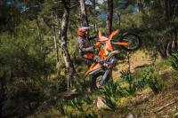 The KTM EXC range features a rider-focused body-position triangle, providing improved knee contact – especially when standing on the pegs – with improved gripping surfaces all around. With the plastics working to expel mud buildup in wet, muddy conditions, a flat seat profile with a high grip seat cover providing exceptional rider movement and control, and a polyamide-reinforced aluminum subframe providing unmatched rider feel and feedback, your only concern is navigating the terrain ahead of you.